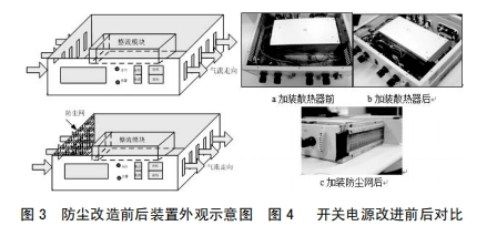3.2在設備本體進風孔加防塵網(wǎng),避免塵土進入設備內(nèi)部,設備維護人員定時對濾網(wǎng)間斷清掃,然后減輕元器件外表覆塵,利于設備正常散熱,如圖3所示加裝防塵網(wǎng)后開關電源標明圖。對設備施行上述改善后,其改善前后對比如圖4所示。