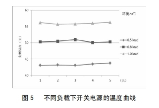 改善后,為考證改善作用,對開關電源分別在0.5倍、0.8倍及1.0倍負載下間斷了為期5天的帶負荷實驗,圖5為不同負載下開關電源的溫度曲線,由圖5可知,跟著負荷的增大,開關電源問題整體呈上升趨向;負載不變的情況下,同一溫度曲線根柢堅持滑潤;開關電源在額定負載下作業(yè),最高溫度不超越57℃,未達報警值,開關電源穩(wěn)定性得到明顯前進。